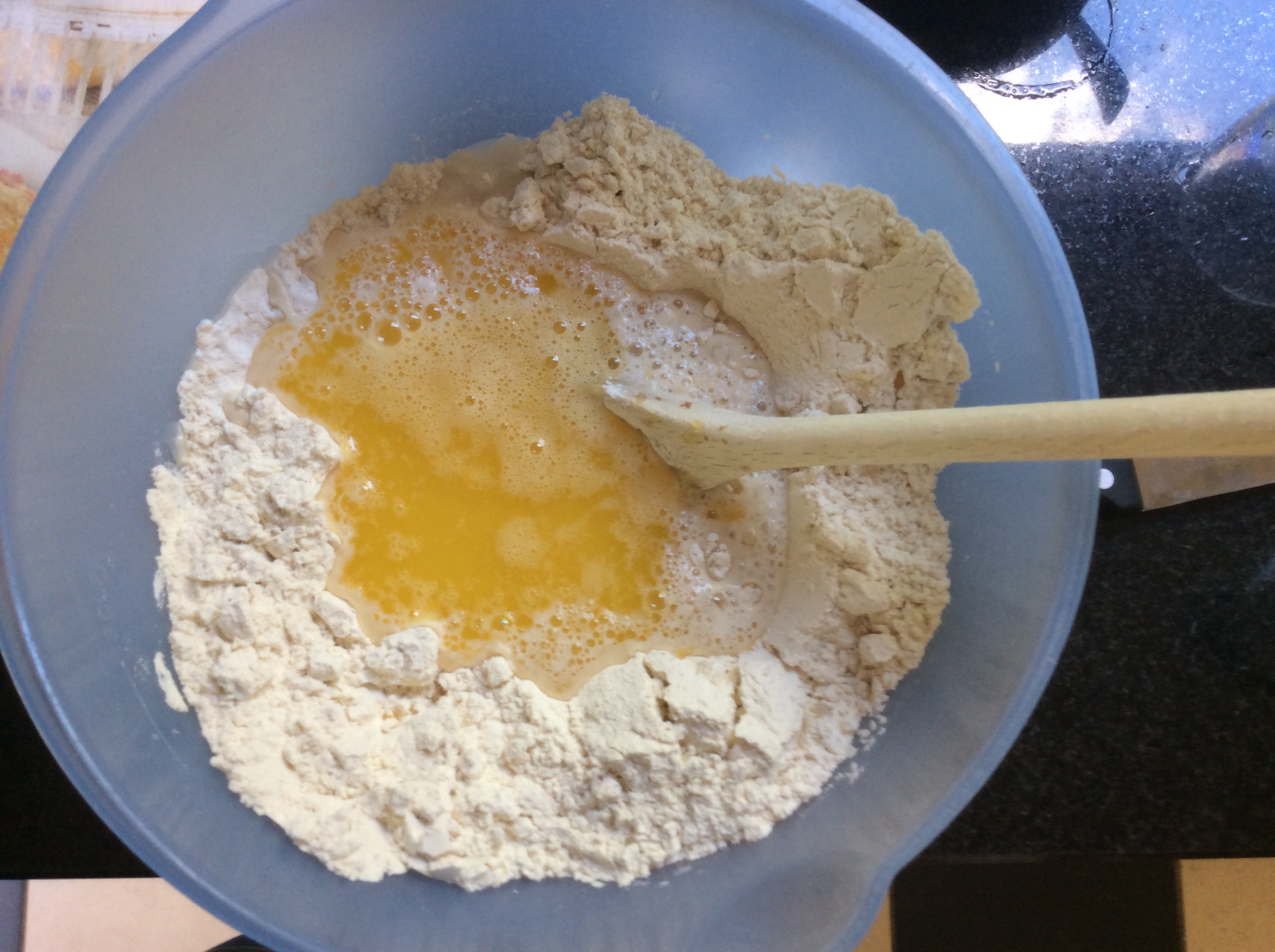 The yeast mixture and the melted butter goes in together. By gradually spooning in the flour, the yeast will slowly get to know the flour, which will benefit its effect. If you stir it all together at once, it just will not work as it should. So patience please. Also, never add salt and yeast together at once. Salt also diminishes the yeast’s effect. I told you, it is a delicate and demanding ingredient. Oh, and it’s best to use a wooden spoon, as this does not leave any taste remnants behind.