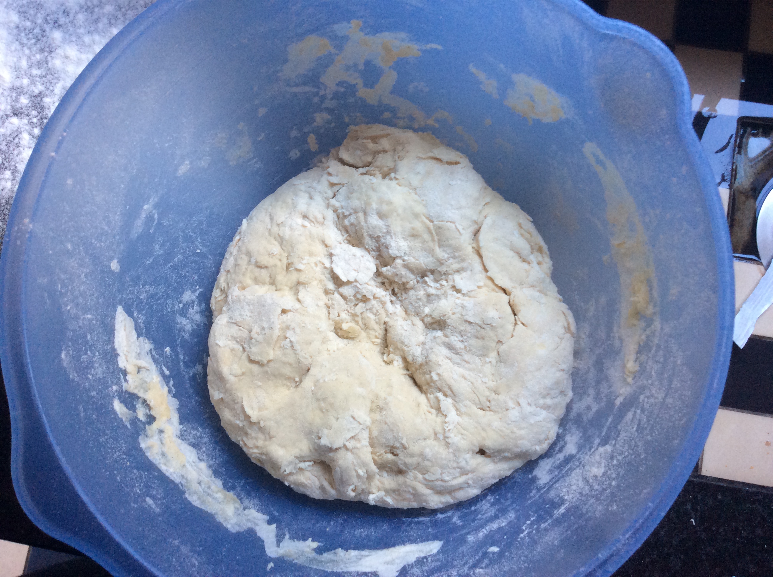 After stirring the mixture into a soft dough, knead it on a lightly floured surface. Be aware that you do not use too much flour, that will mess up the quantities in the dough. So just a slight dusty surface. Be sure to wash your hands for this part!