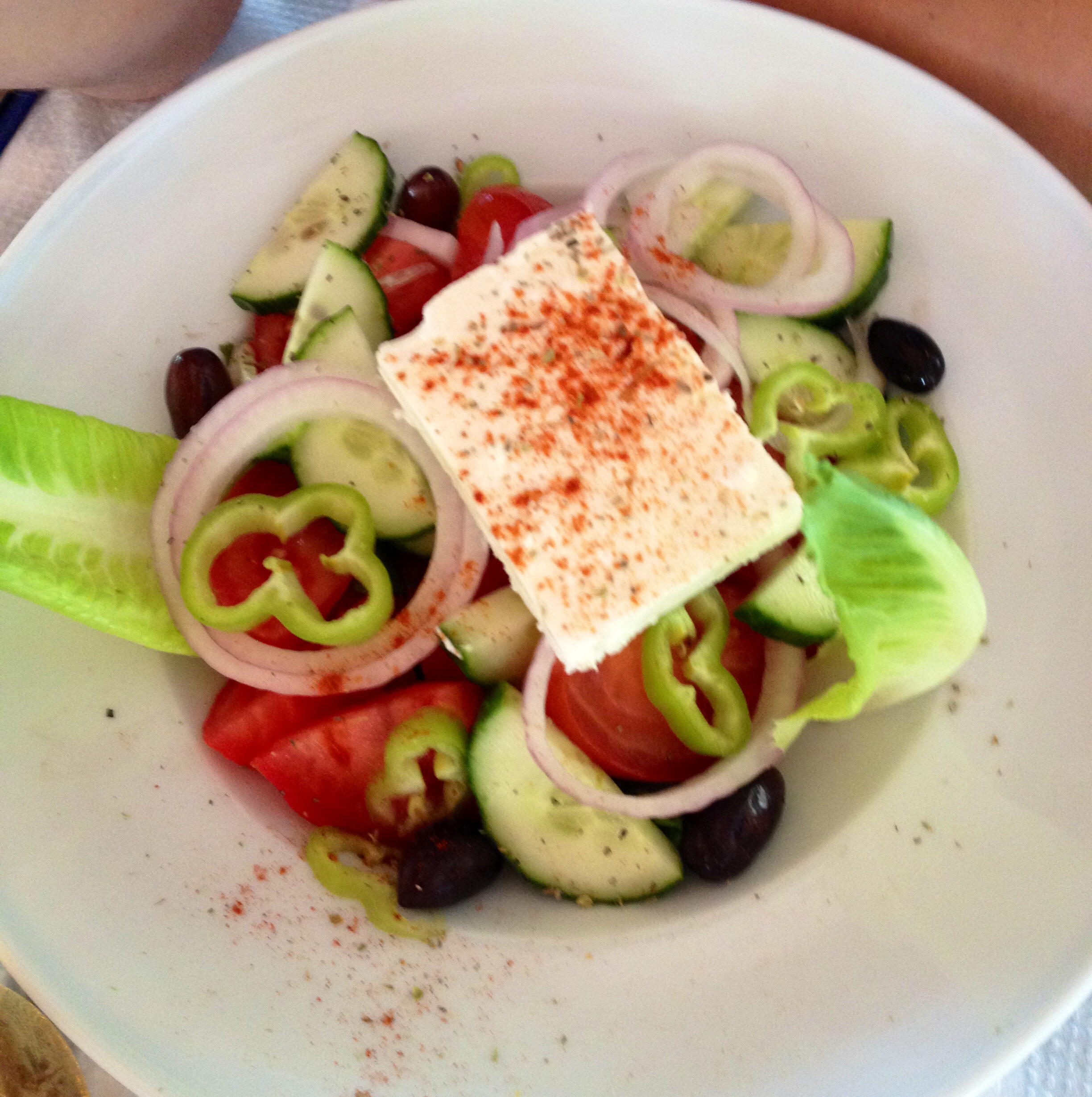 The classic Greek salad that probably everyone in the world is familiar with. Basic ingredients including feta, black olives, red onion, cucumber, green bell pepper, and tomato turn this simple salad into a dish with complex flavours. The cooks also sprinkled over some ground paprika.
