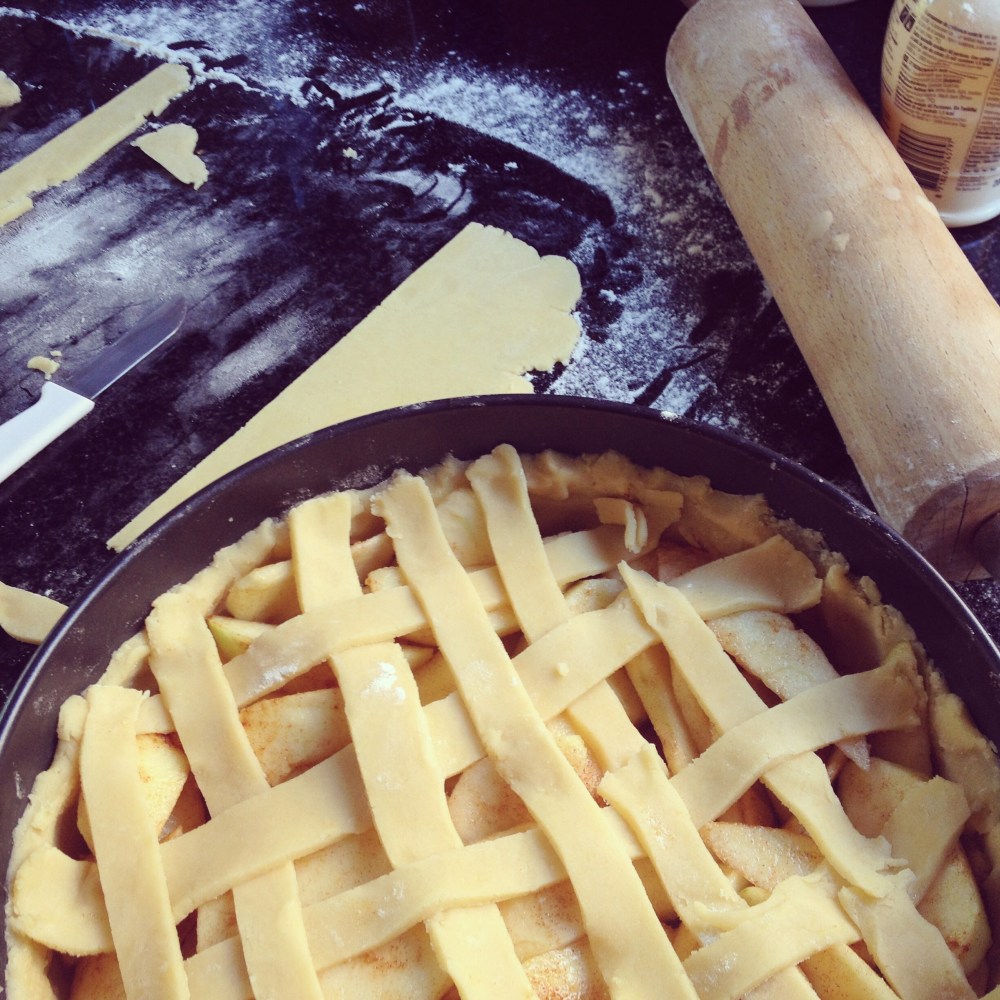 - Preheat the oven to 175C. On a dusted surface, roll out the dough ball and form about 8 thin slices. Place them on the apple mixture in a braiding method (one slice should first go above one slice and then underneath another one and so on) – or you could just lay them out on the pie as you want.