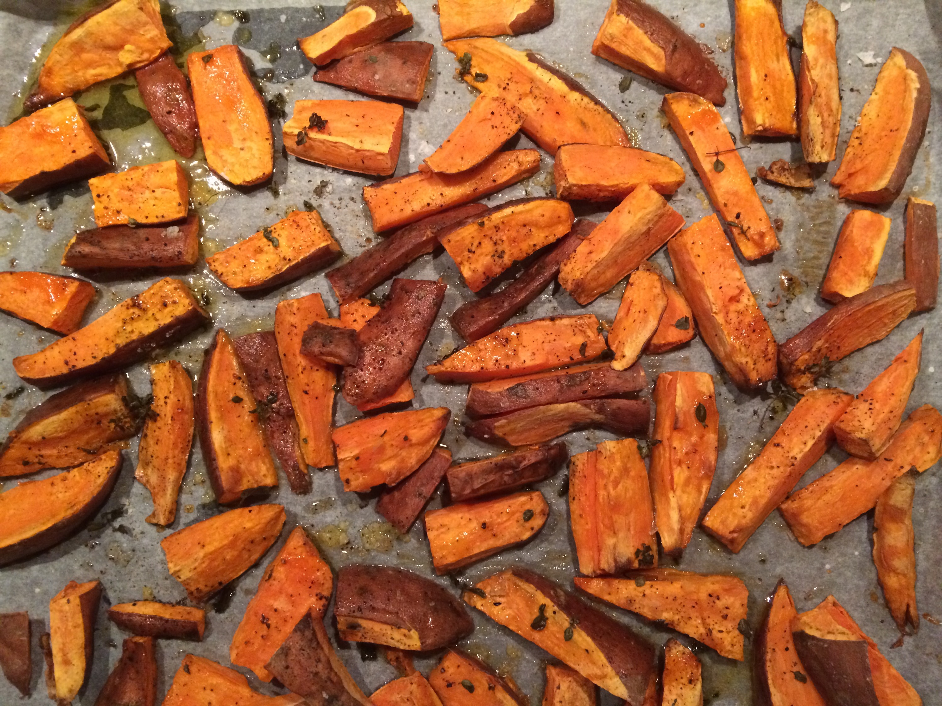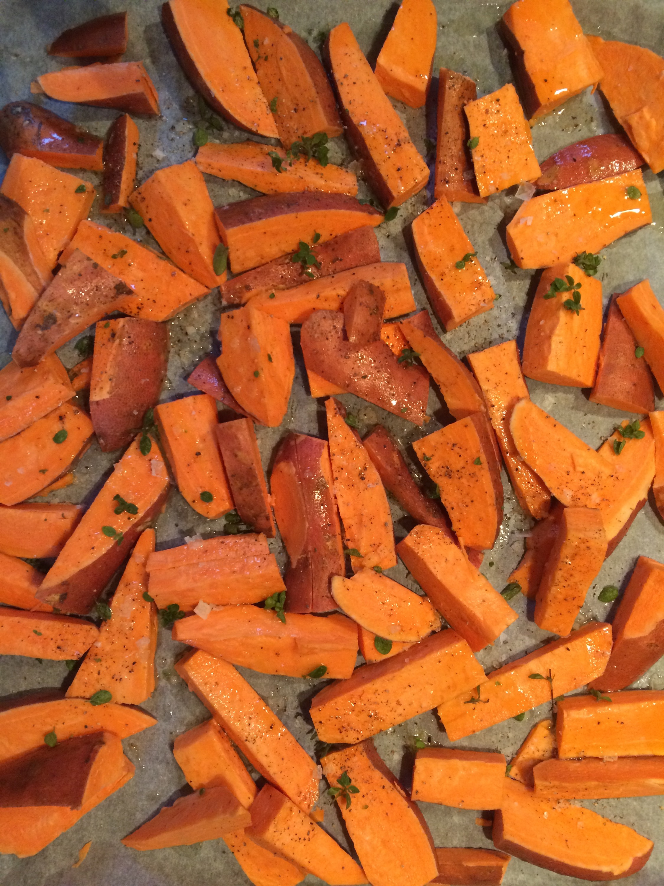 - Rinse the sweet potatoes and make sure there is no dirt on the skin left. Halve them, and slice in fries. Place on the tray.
