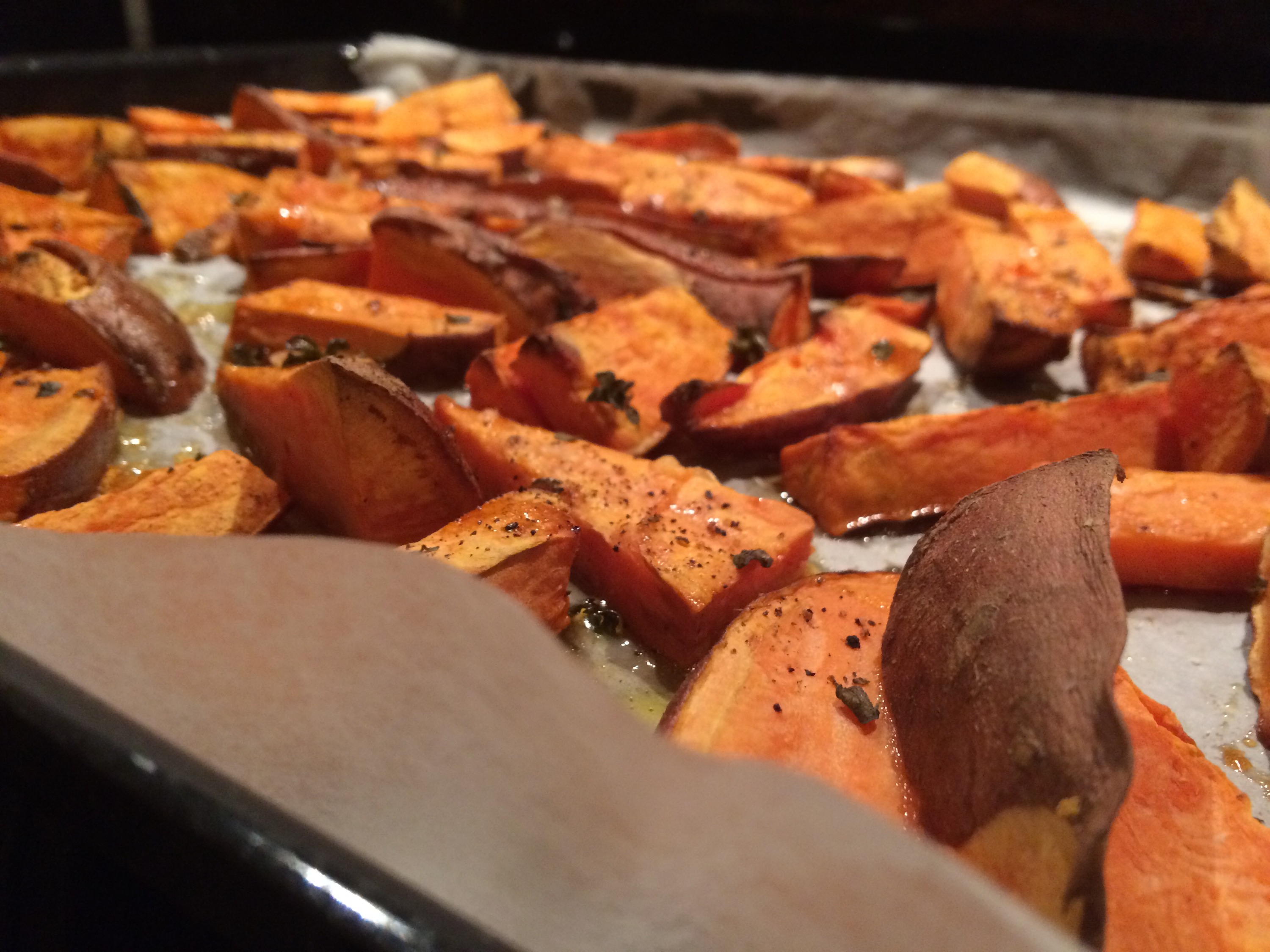 - Coat the sweet potatoes with the olive oil. Sprinkle over the oregano leaves, and season with salt and pepper. Place in the oven for 35 minutes.
